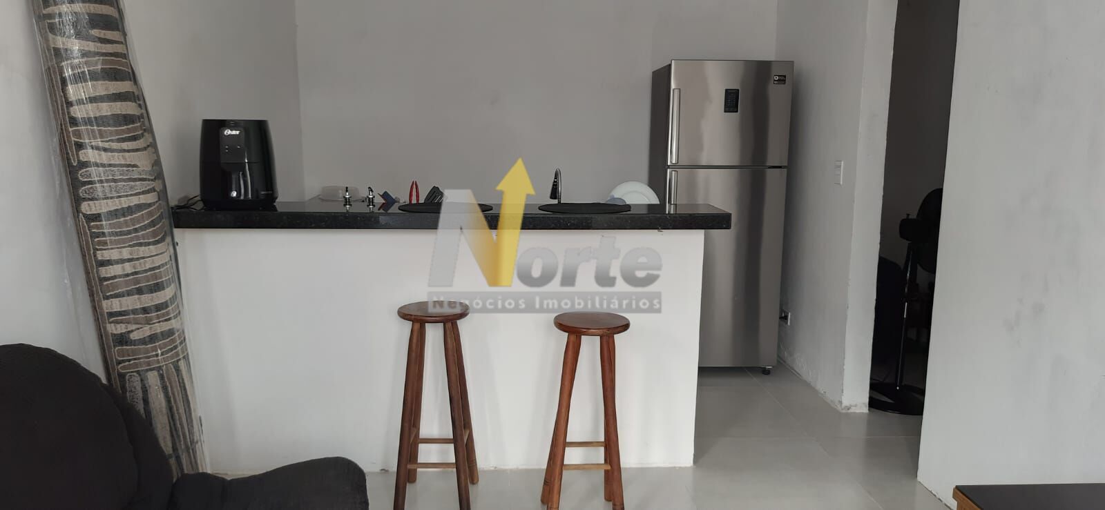 Á segunda casa possui 46 metros quadrados, com 1 quarto amplo, sala, cozinha tipo
